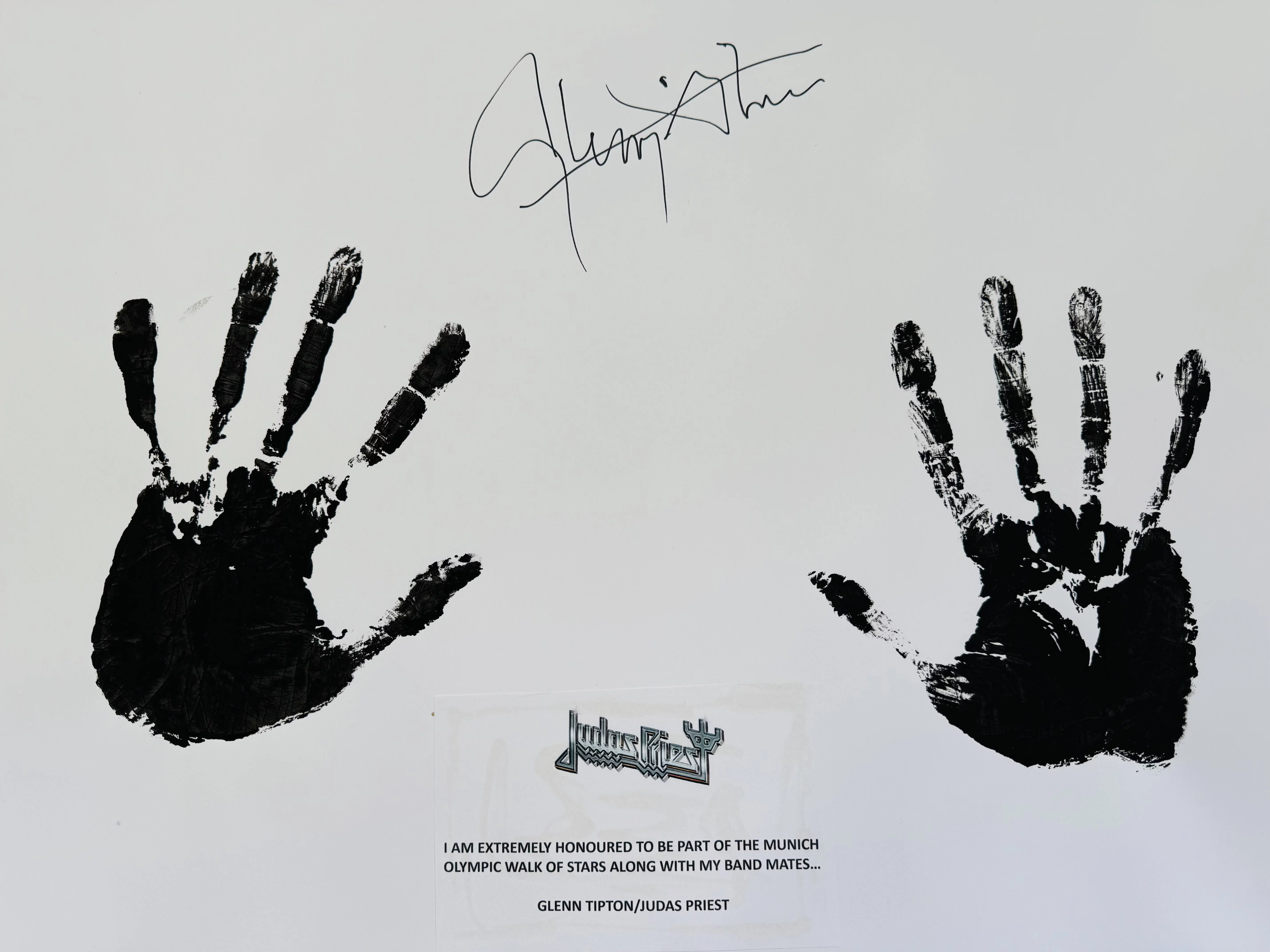 Doch damit war die Geschichte noch nicht zu Ende. Denn wenige Wochen nach der Zeremonie meldete sich noch einmal das Band-Management – auf Wunsch von Glenn Tipton, dem Gitarristen, der wegen seiner Parkinson-Erkrankung nicht mehr auf Tour gehen kann. Tipton hatte von der Verewigung seiner Mitstreiter auf dem MOWOS gehört und wollte nun unbedingt auch seinen Abdruck hinterlassen. Also besorgte er sich schwarze Handfarbe, drückte die Hände auf einen Zeichenblock und schickte diesen per Post nach München. Zwar kann das Papier mit Tiptons Handabdruck nicht neben der Bodenplatte seiner Band eingelassen werden – ein würdiger und dauerhafter Platz hier in der virtuellen Galerie ist ihm aber garantiert. Thank you, Glenn.